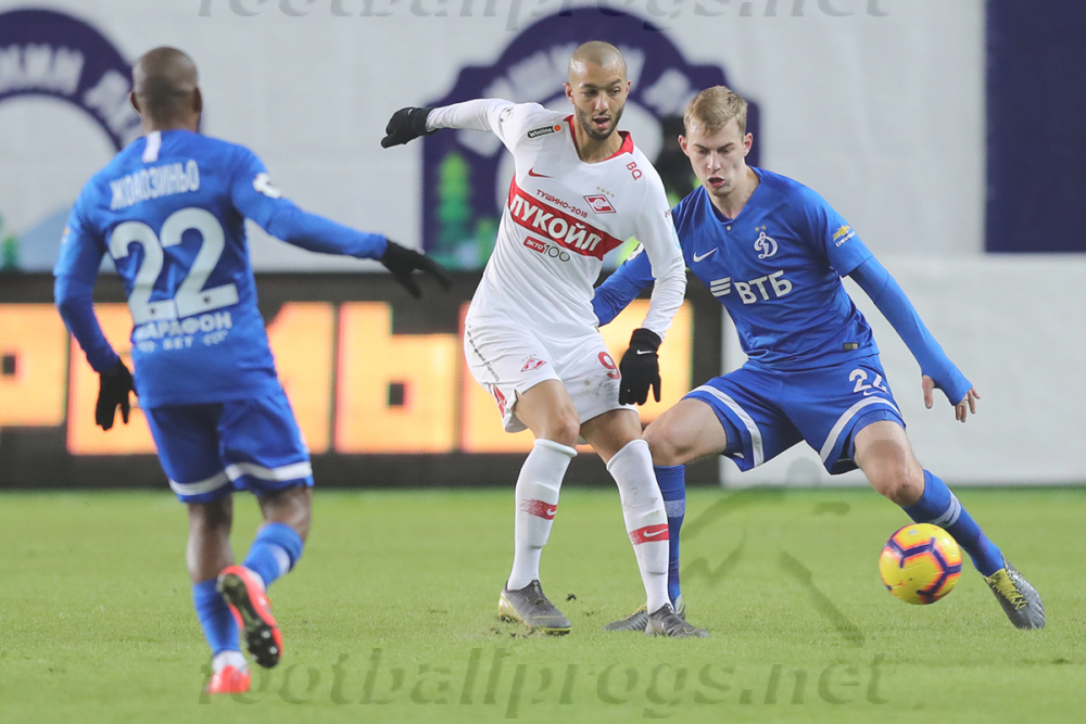 Первый голевой момент красно-белые создали на 6-й минуте: Зе Луиш выдал отменный пас на ход Ханни, алжирец ворвался в штрафную, где дважды крутанул динамовца Евгеньева, но в дальний угол, к сожалению, не попал. Динамовцы ответили неточным опасным ударом Черных.