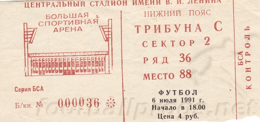 Москва. Центральный стадион имени В. И. Ленина. 6 июля 1991 г. Пасмурно. В первом тайме проливной дождь. 23 градуса. 7000 зрителей.
