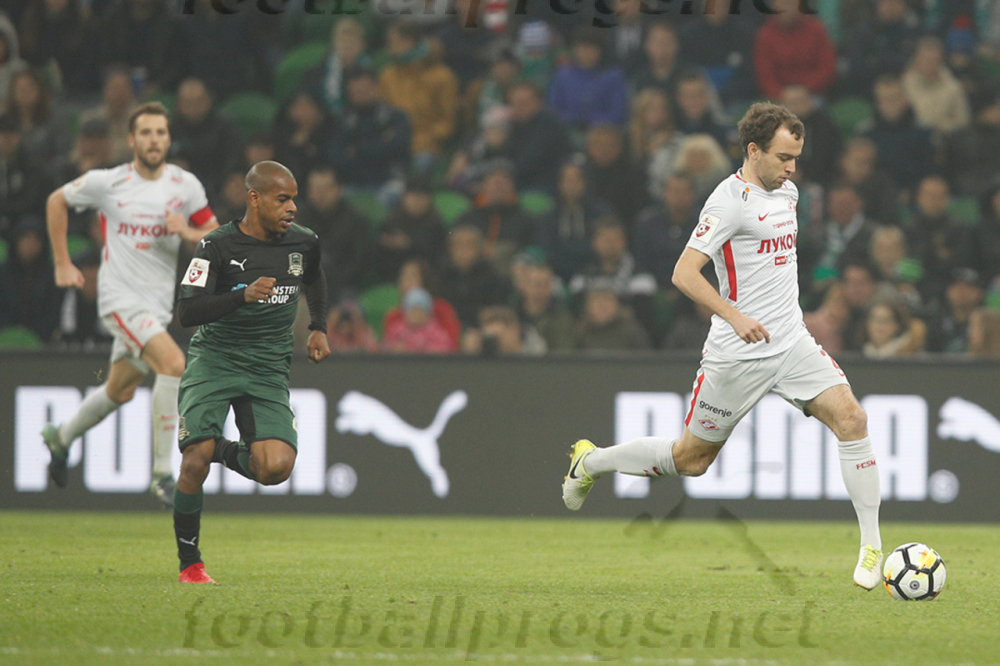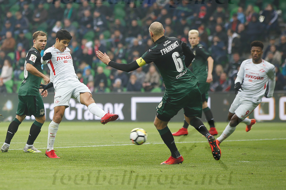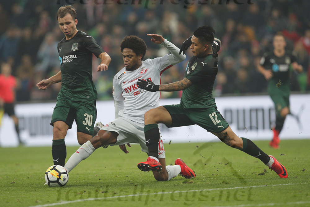 «Спартак» вышел, по сути, с четырьмя номинальными форвардами – с Мельгарехо, Промесом, Зе Луишем, Адриано. Конечно, они меняли позиции, кто-то периодически опускался ближе к полузащите, но все четверо были нацелены на атаку. «Краснодар» отрядил вперед Смолова, а по краям ему помогали Классон и Подберезкин.
