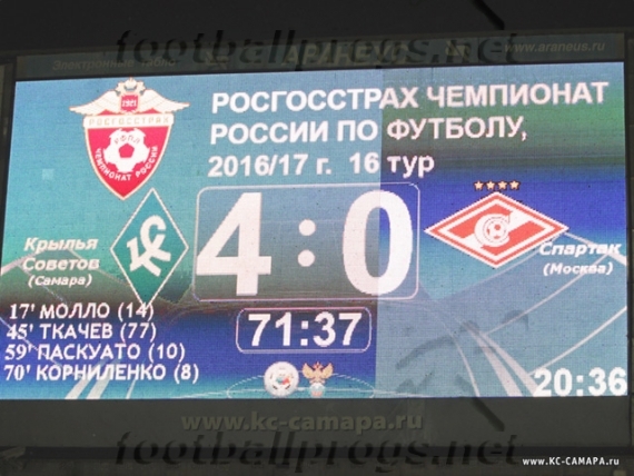Не зря так настаивали на проведении матча «Крылья Советов». Вряд ли когда-нибудь в обозримом будущем им удастся похвастать аналогичным успехом в игре против «Спартака», а в прошлом такого не случалось точно. Уже в дебюте самарцы очень кстати заработали и реализовали пенальти. После этого их контратакующая модель стала более оправдана, а «Спартаку», побеждавшему последнее время скорее за счет надежности сзади, стало трудно. Кое-какие шансы у москвичей были, но реализовать их не удалось. Зато получилось пропустить в раздевалку от убежавших в контратаку «крылышек». Слаженная и умная работа группы атаки привела к голу Ткачева, после которого запахло сенсацией. Резервов для кардинального изменения игры у Карреры не оказалось, а за полчаса до конца самарцы провели ещё одну образцовую комбинацию, сделав счет крупным. Ещё десять минут ушло у них на четвертый гол, забитый в очередной контратаке. После этого «Крылья Советов», наконец, успокоились и довели дело до заслуженной победы. Второй кряду крупный успех «крылышек», которым остается сожалеть, что Скрипченко не возглавил их раньше. А «Спартак» получает мощный удар и подпускает преследователей. Теперь очень важно собраться на последний до перерыва тур.