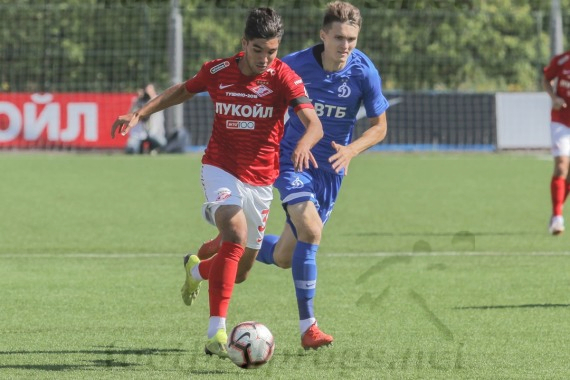 Спартаковцы начали дерби резво, по-хозяйски. Их атаки волнами накрывали оборону бело-голубых, которой приходилось тяжело справляться с набегами хозяев. Такая активность привела к быстрому голу в ворота нашей команды. Прошляков попытался пробиться через центр, но был остановлен. Тем не менее, мяч достался Сергею Ерёменко, который роскошным ударом из пределов штрафной пробил в дальнюю девятку ворот Зирикова – 0:1. Неприятное начало, ушат ледяной воды. Бело-голубые старались дать адекватный ответ, но «Спартак» и не думал сбавлять обороты. Всё тот же Прошляков выцеливал дальний верхний – мяч чудом разминулся с каркасом ворот. Активен был Сергей Ерёменко, в ногах которого сосредотачивался весь конструктив молодёжки «Спартака». Впрочем, примерно с 20-й минуты задор молодых спартаковцев постепенно угас, что дало шанс нашей команде перевести игру к чужим воротам. Правда, при большом территориальном и игровом превосходстве у динамовцев напрочь пропал последний пас. До штрафной Поплевченкова мяч ходил бодро, но внутри спартаковских владений креатив куда-то исчезал. Красно-белые атаковали гораздо острее.